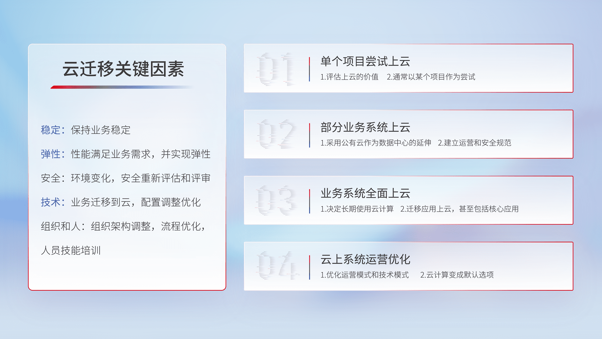 结合实际业务,,,从规划设计、、云平台选型、、、、云原生改造、、、、数据迁移、、、集成交付,,,迁移全过程为客户识别最佳上云路径,,,做好风险识别管理,,,,设计网络架构、、、身份权限、、、安全审计合规、、、操作审计、、、、日志审计、、、监控告警策略、、、、多站点容灾设计等,,,,对云上基础设施进行整体规划,,提升IT治理水平,,,,以满足弹性、、、、高可用、、、高性能的需求。。。