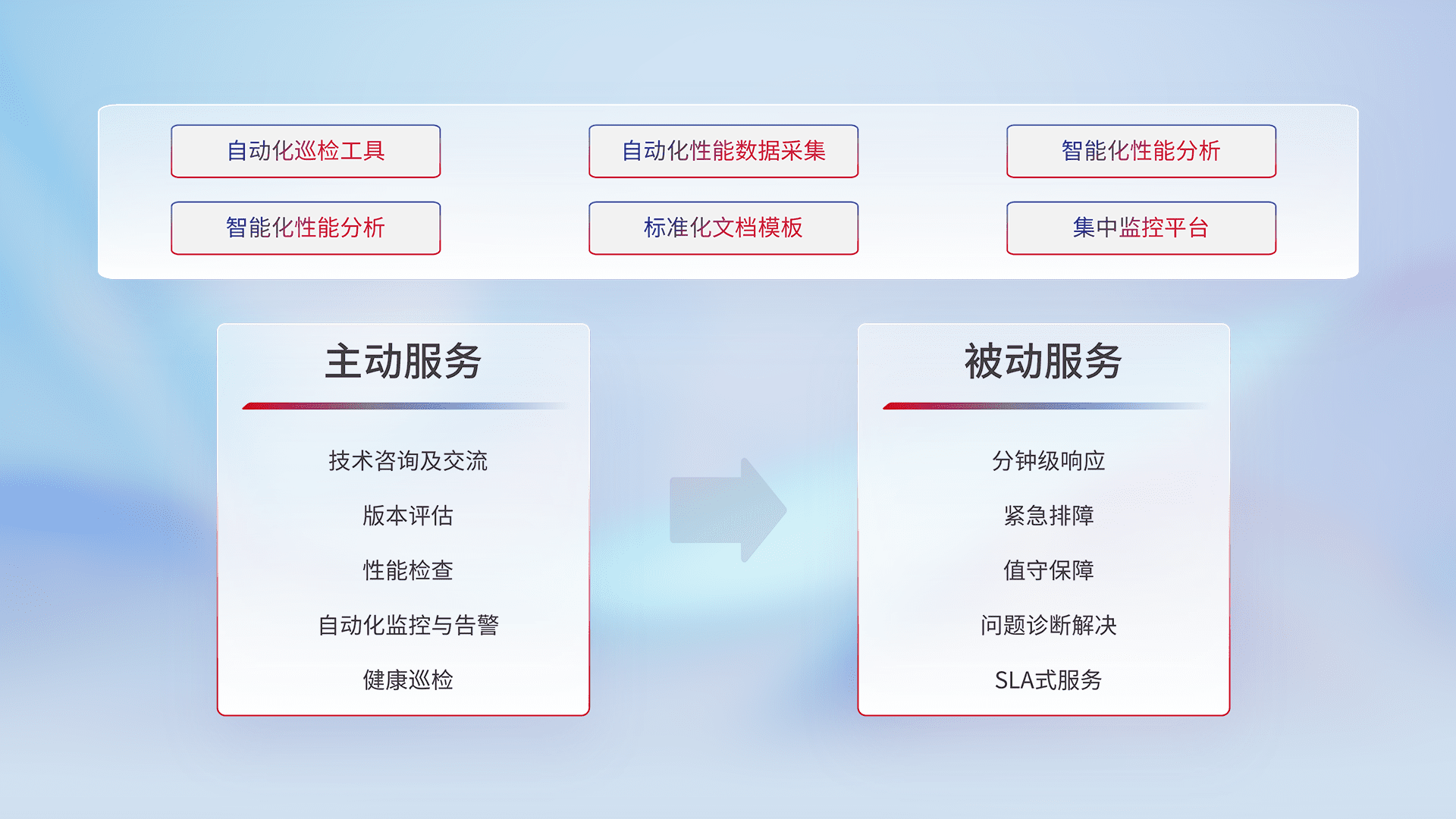 智能化工具和标准化文档,,保障服务质量,,,提供主动服务(包含技术咨询、、版本评估、、、、性能检查、、、、自动化监控与告警、、健康巡检)和被动服务包含(分钟级响应、、、、紧急排障、、值守保障、、、、问题诊断解决、、、SLA服务)。。。