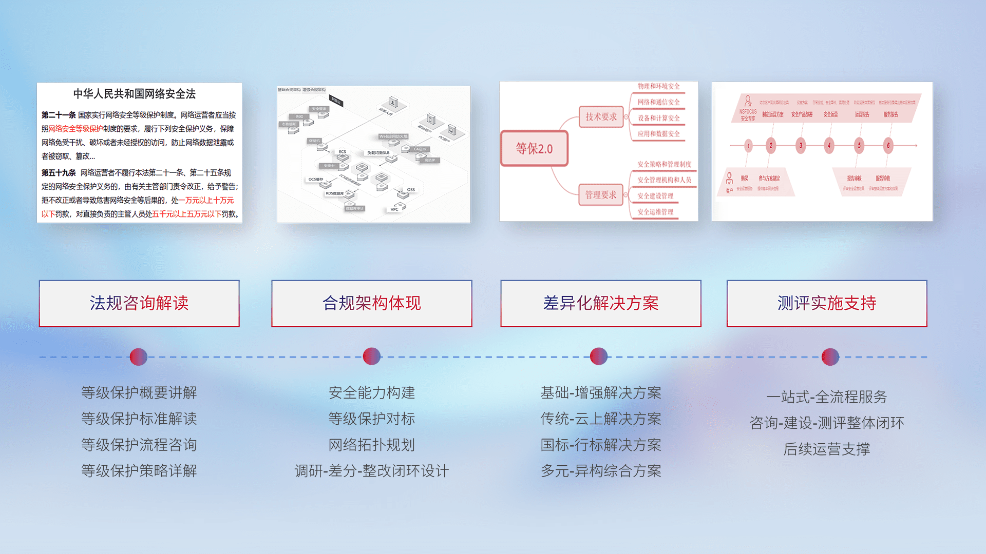通过专业的法律咨询解读、、、合规架构体现、、差异化解决方案、、、测试实施支持等服务,,,为客户量身打造等保合规体系。。